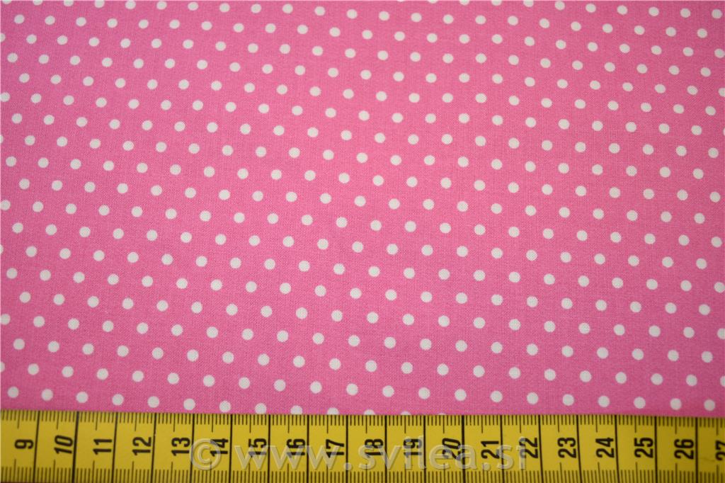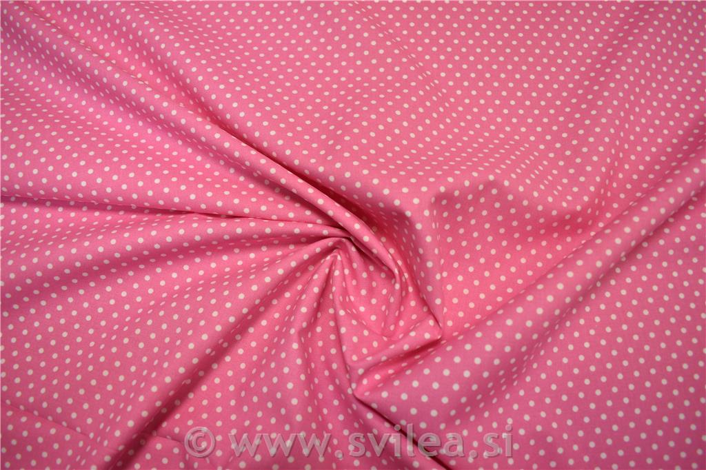 Metrsko blago bombažni poplin bele pike velikosti 3 mm na roza podlagi. Sestav: 100% bombaž širina: 150 cm, teža: 120g/m2