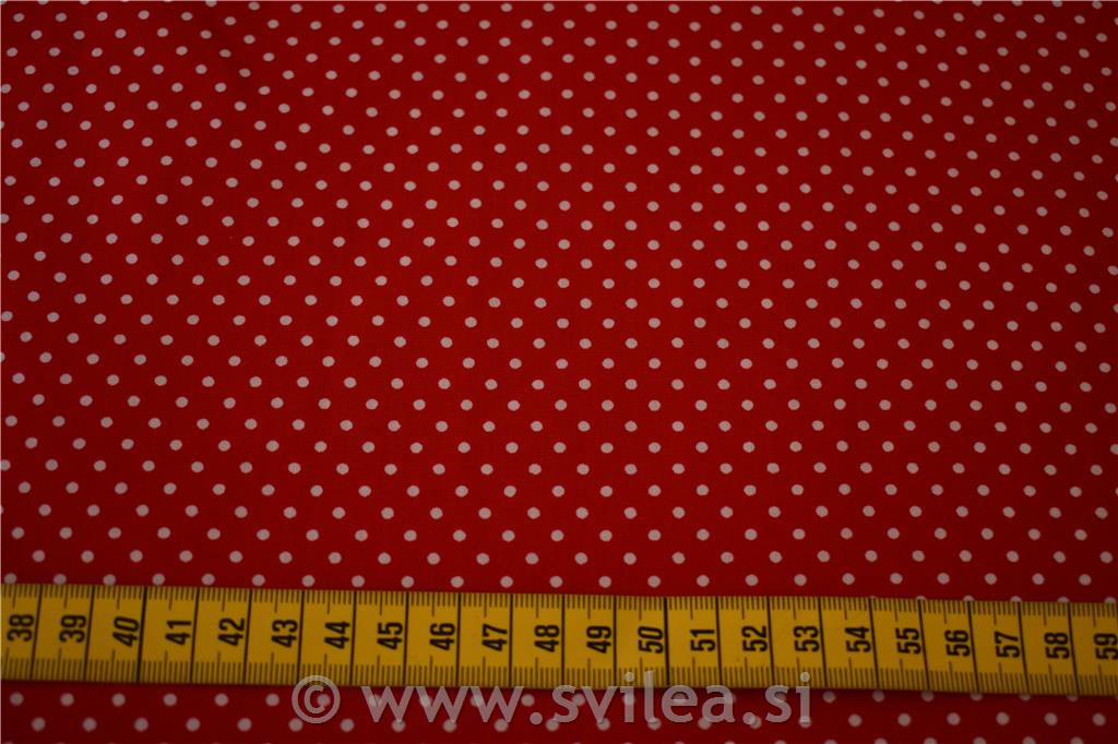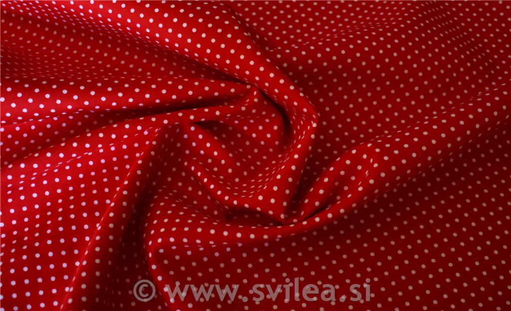 Metrsko blago bombažni poplin bele 2 mm velike pike na živo rdeči podlagi. Sestav 100% bombaž širina 145 cm teža 110 g/m2. Blago je primerno za otroško posteljnino, pižamice, gnezdeca... Pred pričetkom krojenja je blago priporočljivo oprati zaradi krčenja.