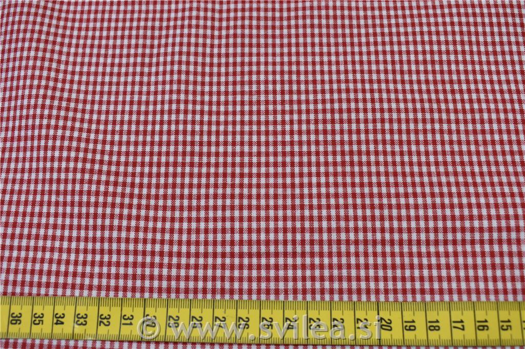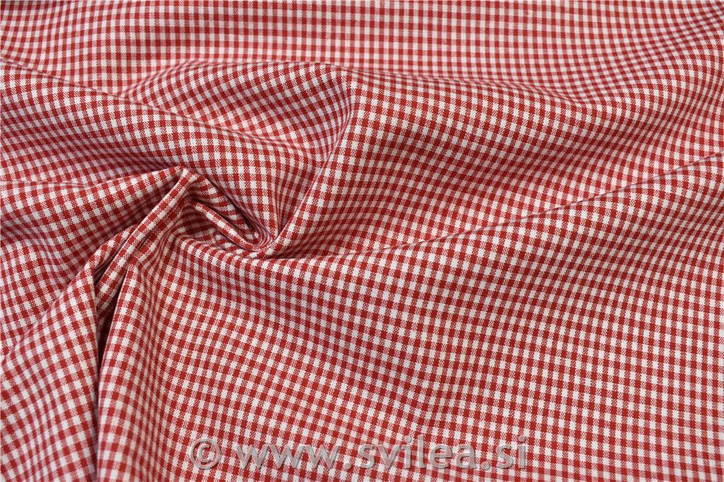 Metrsko blago bombažni poplin drobni rdeči karo. Sestav: 100 % bombaž širina 140 cm teža 130 g/m2. Blago je primerno za izdelavo bluz, sraic, kril, igrač, podlog, prtov...