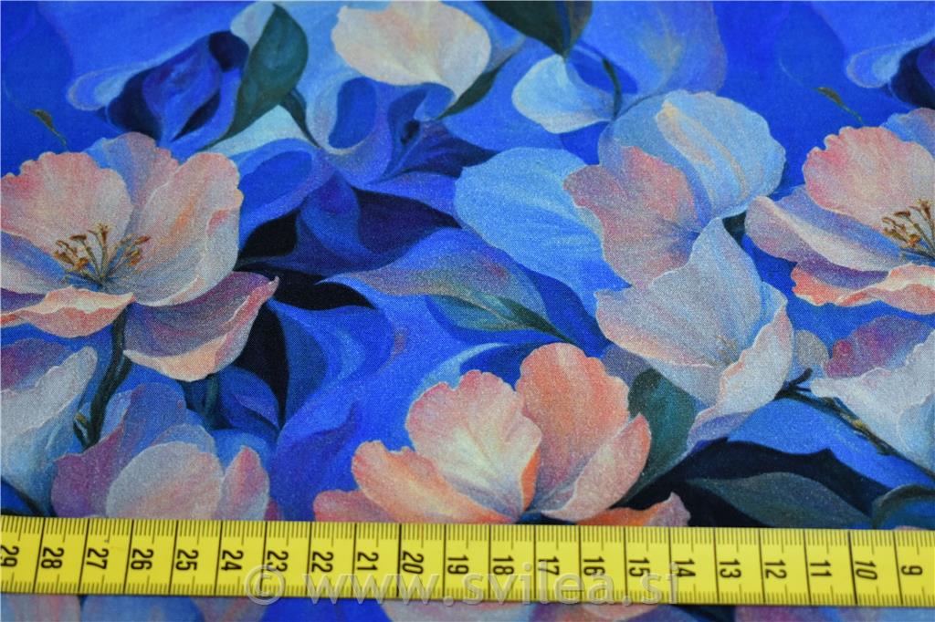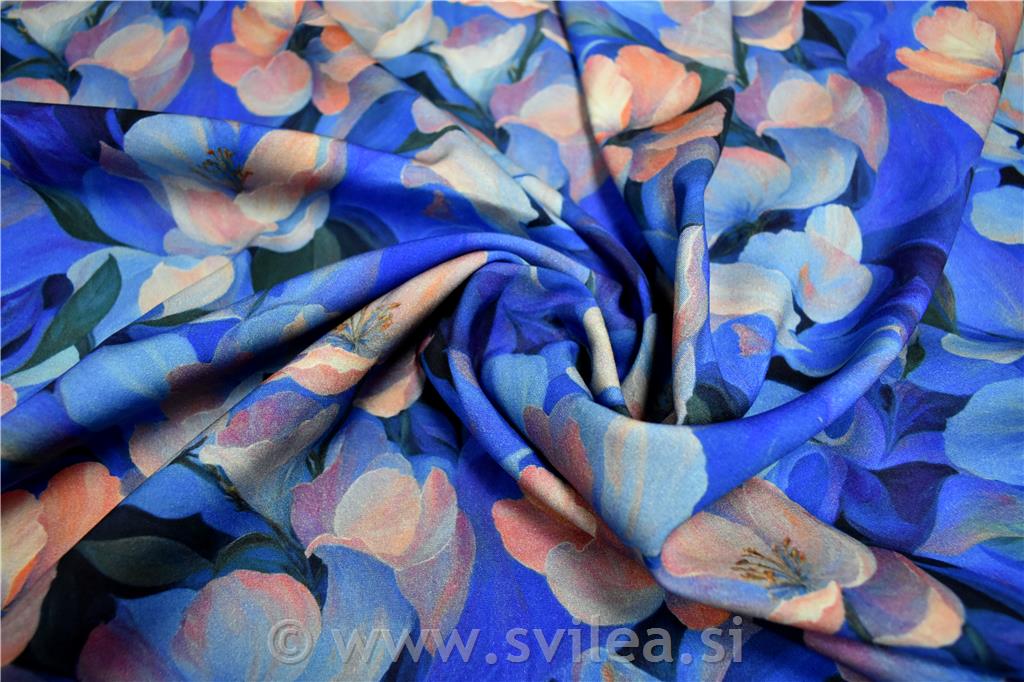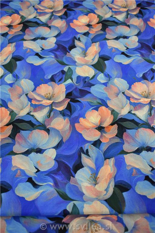 Viskoza z elastanom digital - losos rože na modrih odtenkih