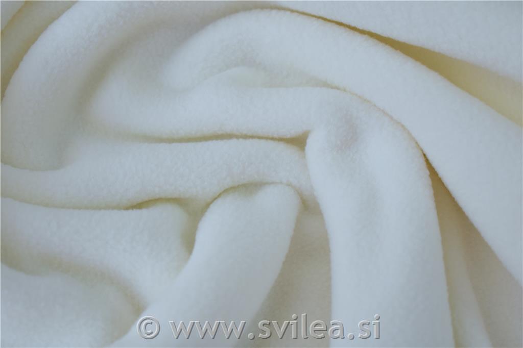 Metrsko blago termovelur flis v beli barvi. Se hitro suši, je lahek in topel. Primeren za izdelavo šalov, jaken, jopic, kap, rokavic.... Blago je pralno, vendar brez mehčalca.