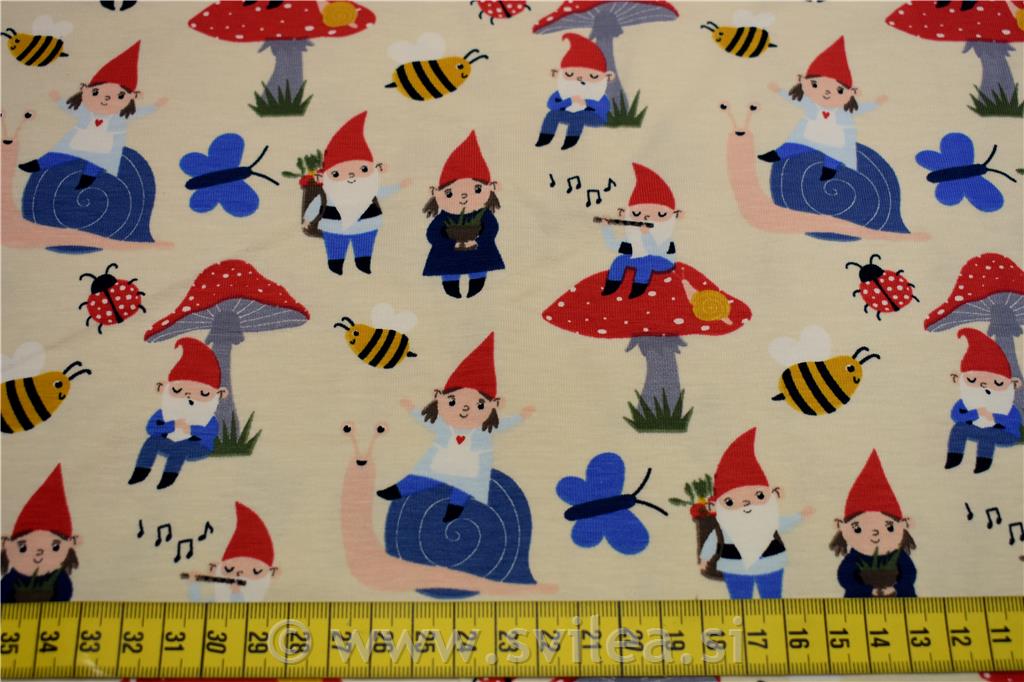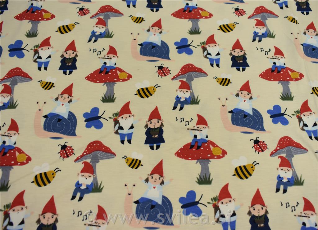 Metrsko blago palčki, čebelice, metulji, mušnice polži na vanilja osnovi. Sestava blaga: 95 % bombaž 5 % elastan širina 140 cm teža 200 g/m2. Blago je primerno za izdelavo majic, trakov, patentov, tunik, aplikacij, hlač... Kot samostojni izdelek ali v kombinaciji z enobarvnim jerseyem. Zaradi krčenja je blago priporočljivo oprati pred pričetkom krojenja. Pri šivanju se svetuje uporaba igle za strech materiale.