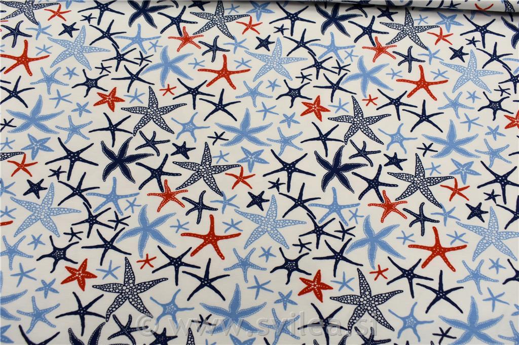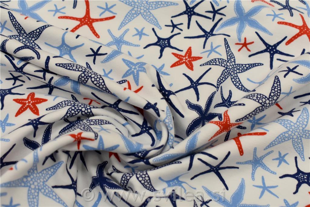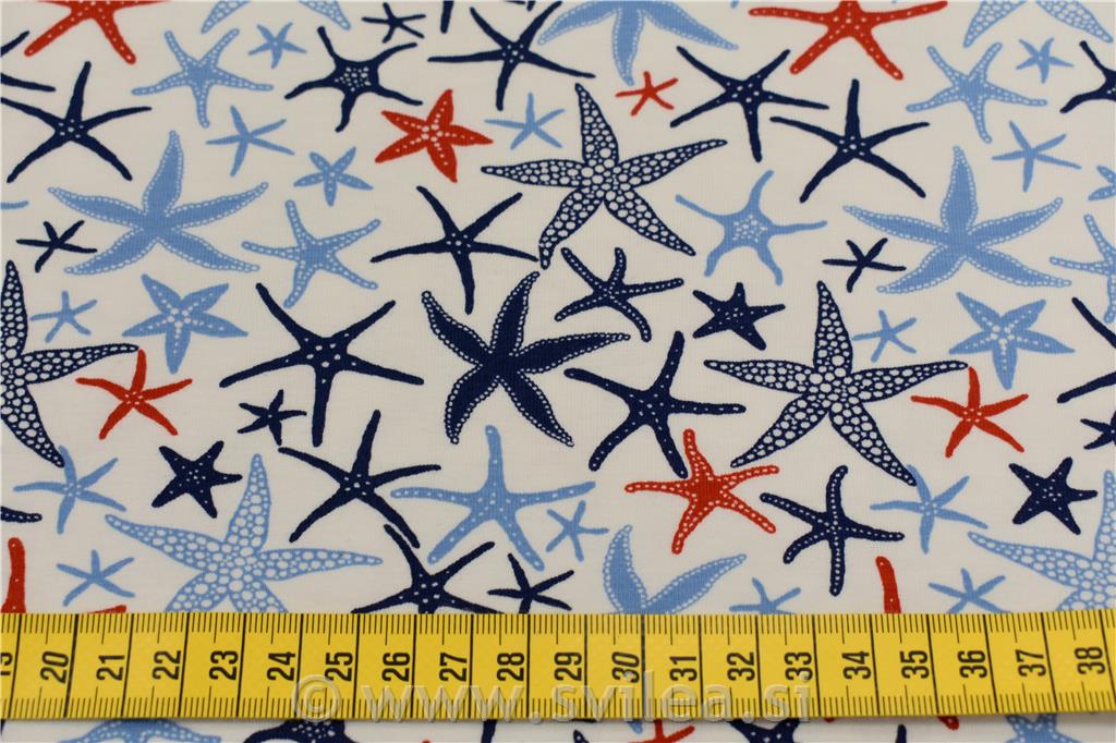 Bombažni jersey z motivom rdečih, svetlo in temno modrimi morskimi zvezdami na beli osnovi. Sestava: 95 % bombaž 5 % elastan, širina 145 cm, gramska teža 200 g/m2. Jersey je primeren za izdelavo majic, tunik, baggy hlačk, kratkih hlač... Kot samostojni izdelek ali v kombinaciji z enobarvnim blagom. Zaradi krčenja je blago priporočljivo oprati pred pričetkom krojenja.