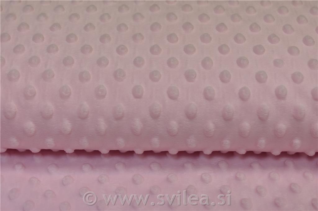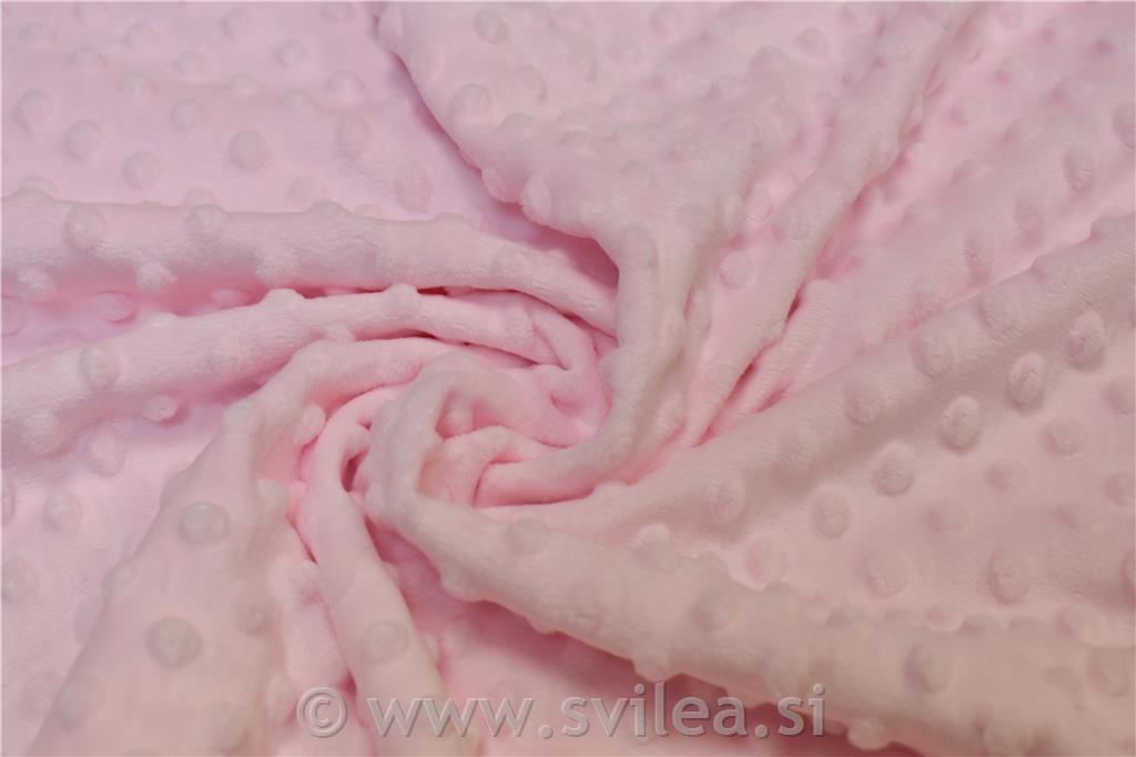 Metrsko blago minky v nežno roza barvi. Sestav: 100 % poliester širina 150 cm teža 210 g/m2. Blago je prijetno na otip in mehko. Primerno je za izdelavo toplejših oblačil, kapic, tulcev, šalov... Odsvetuje se sušenje v sušilnem stroju.